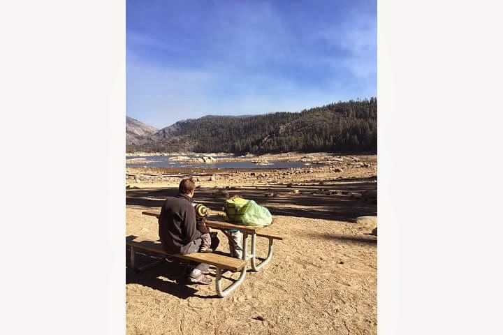Well, we wanted the the crabby birthday boy to get in a good morning nap, so we could head up the hill and pretend we are that "adventurous" family that doesn't obsess over "schedules" and "naps." Totally us, right? We went up to Pinecrest and because the snow is on its way, the lake is almost completely empty. It was so cool being in an empty lake, the tree stump and rocks, oh my! It was so weirdly beautiful. It was also a three year old's dream landscape...little boy's heaven!
